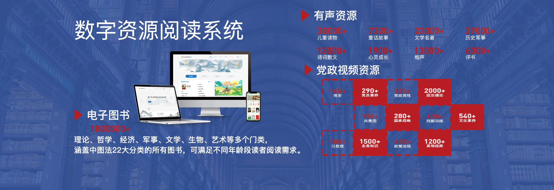 電子圖書(shū) 多媒體管理 電子書(shū)瀏覽 有聲聽(tīng)書(shū) 數(shù)字資源統(tǒng)一跨庫(kù)檢索 智慧圖書(shū)館 智慧閱讀 數(shù)據(jù)整合 數(shù)字借閱 一鍵借閱 無(wú)感借還 智能書(shū)架 大數(shù)據(jù)智慧墻 物理空間使用的靈活性 智慧圖書(shū)館協(xié)同工作 視覺(jué)搜尋與可視化 服務(wù)的開(kāi)放性與泛在化 高質(zhì)量教育體系建設(shè)